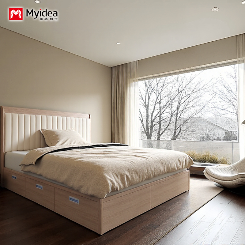 モダンミニマリスト多機能ベッド 引き出しキャビネット付き、クリーム風レザーアートベッド、小型三段引き出しダブルベッド