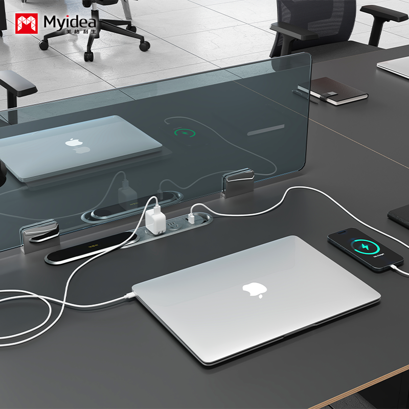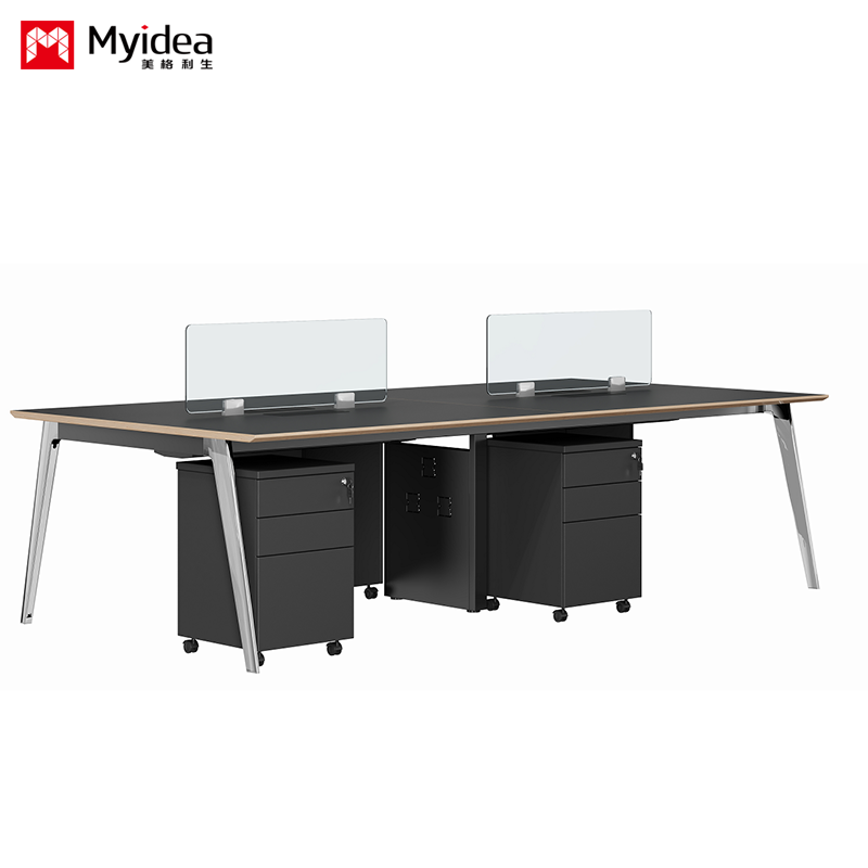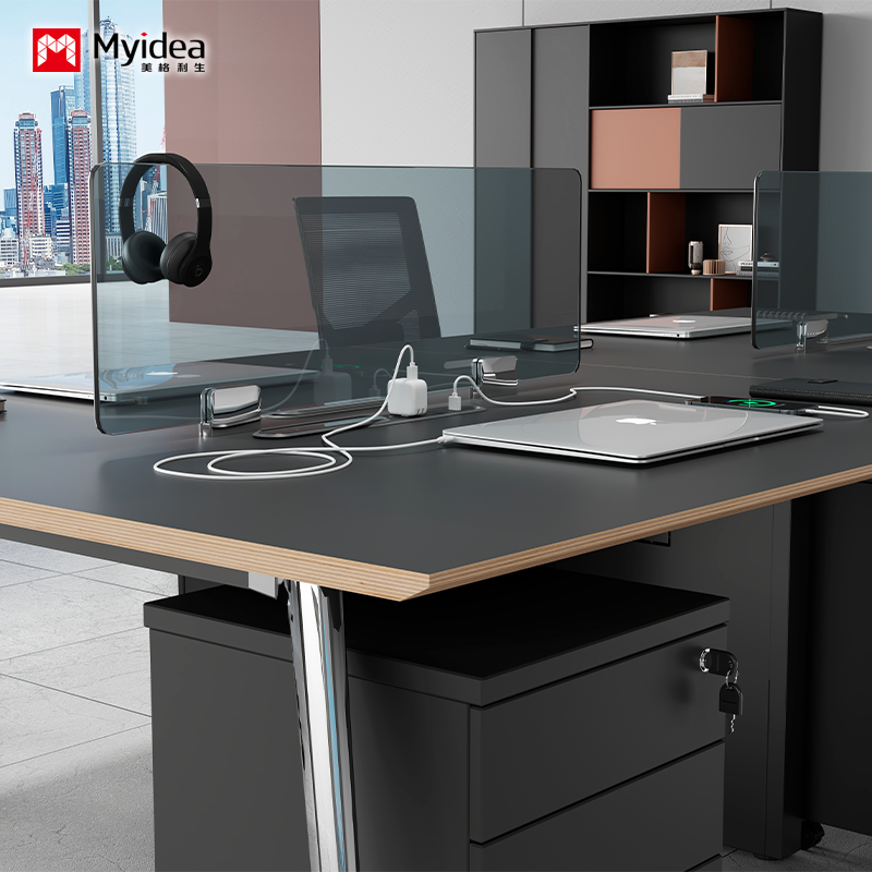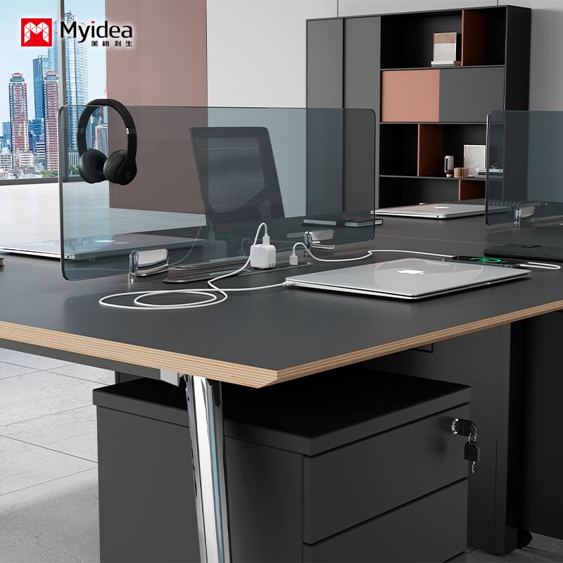 パーソナライゼーション スタッフのデスクはシンプルでモダンで 4つのマニュアルワークステーションがあり デスクはきれいで実用的で スクリーンがあります
